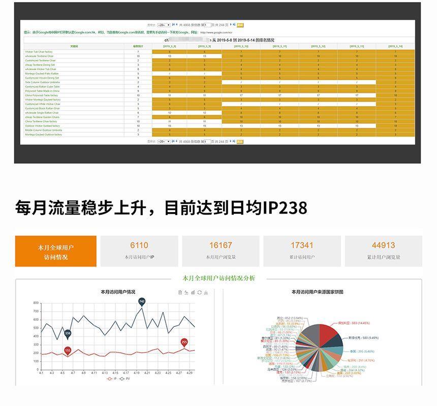 客戶自開通外貿快車以來,一直注重平臺的運營及維護工作,目前網站已發布1340個產品,70%以上的產品相似度都保持在75%以下。頁面數量多、質量高,因此被谷歌收錄的頁面數量也多,進而大大提升了網站的流量。目前網站日均流量高已突破300個,后臺共計收到400多個詢盤(不包含客戶直接發郵件至郵箱的咨詢)。