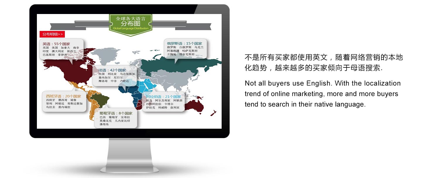 一鍵生成全球100多種語言的產(chǎn)品介紹網(wǎng)頁(yè),覆蓋全球100多個(gè)國(guó)家的采購(gòu)商搜索習(xí)慣和多語言閱讀習(xí)慣,幫助中國(guó)外貿(mào)企業(yè)不僅僅開拓英語主流國(guó)家、更全面拓展全球小語種藍(lán)海市場(chǎng)