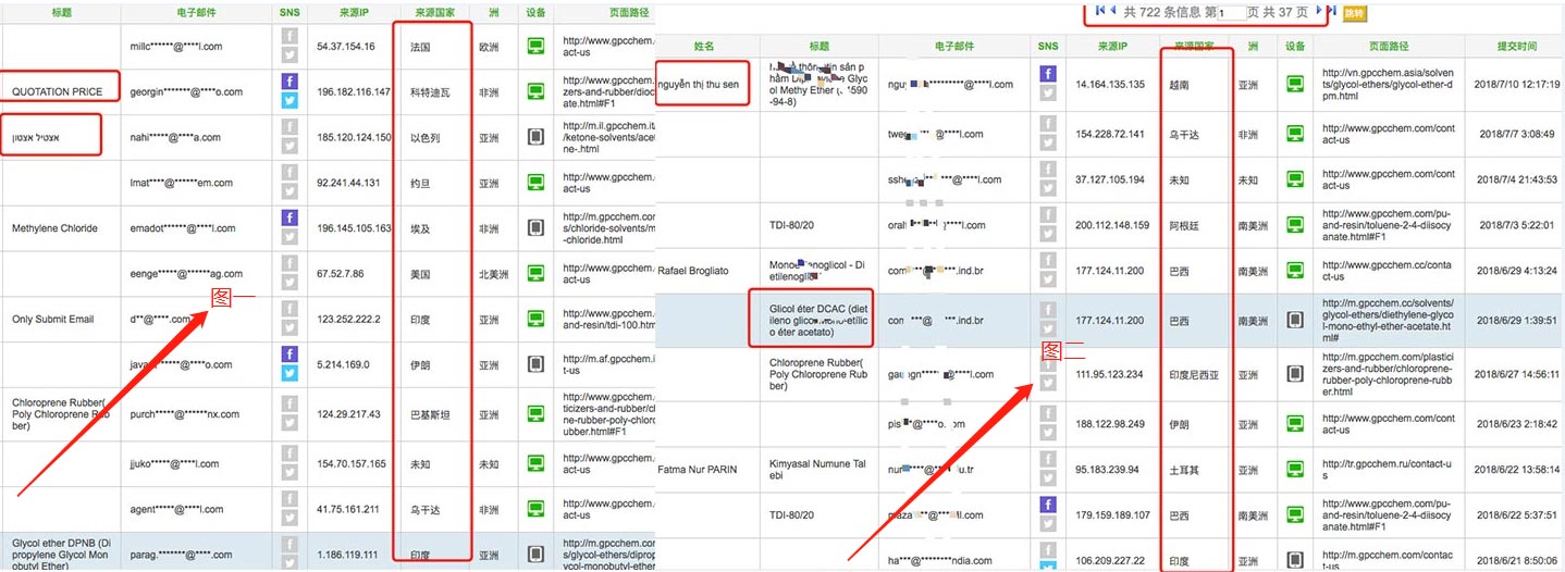 圖一中很多采購(gòu)商習(xí)慣用母語訪問并發(fā)送詢盤;圖二總詢盤722個(gè),很多非英語國(guó)家?guī)淼牧髁哭D(zhuǎn)化的詢盤;