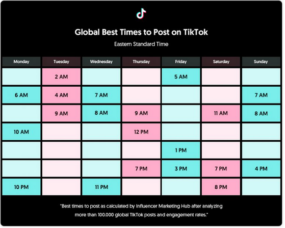 在最佳時間發(fā)布您的標(biāo)簽內(nèi)容,以確保最大程度的可見性。在評估了來自世界各地的 100,000 條帖子的表現(xiàn)后,我們編制了下面的圖表,以幫助您找出TikTok 的最佳發(fā)布時